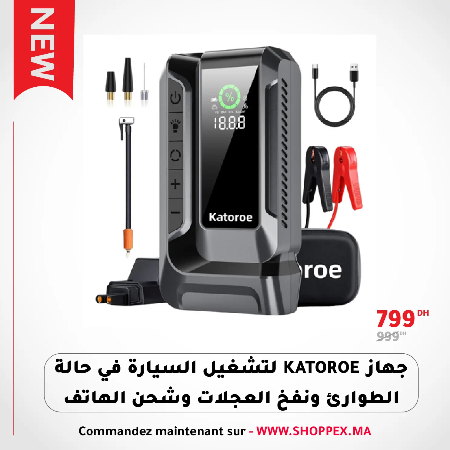جهاز لتشغيل السيارة في حالة الطوارئ ونفخ العجلات وشحن الهاتف katoroe